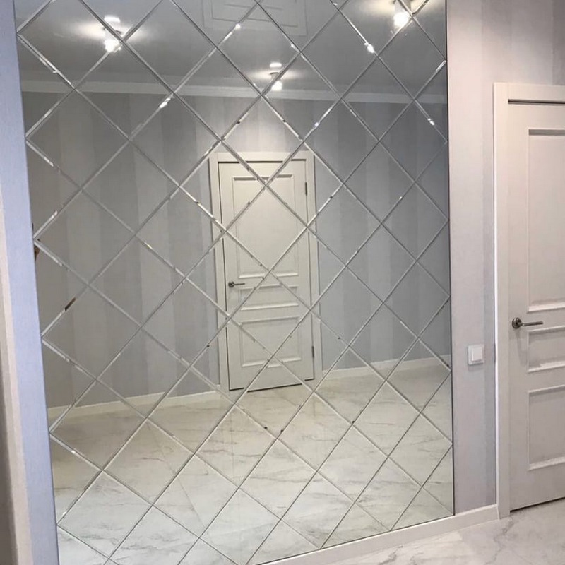 Использована зеркальная квадратная и треугольная плитка с фацетом.